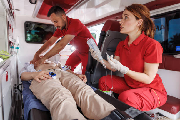 Tim Medis Darurat Beraksi: Momen Kritis di Dalam Ambulans Perawatan Intensif di Ruang Gawat Darurat Bergerak Gambar ini menangkap esensi